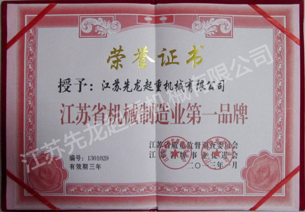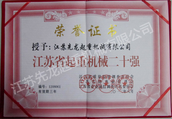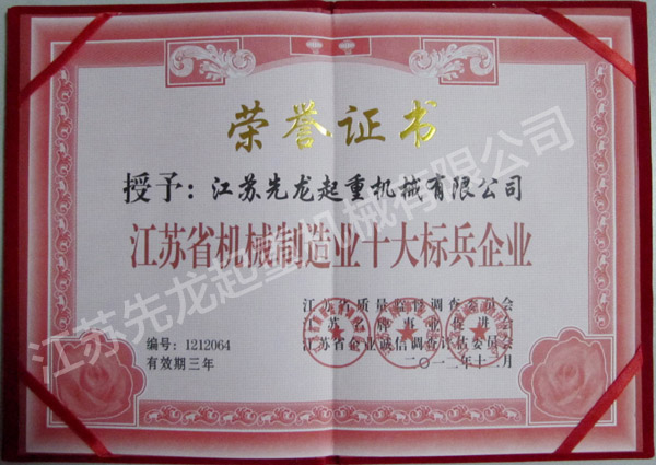 | 江苏省起重机械二十强 | 江苏省机械制造业十大标兵企业 |